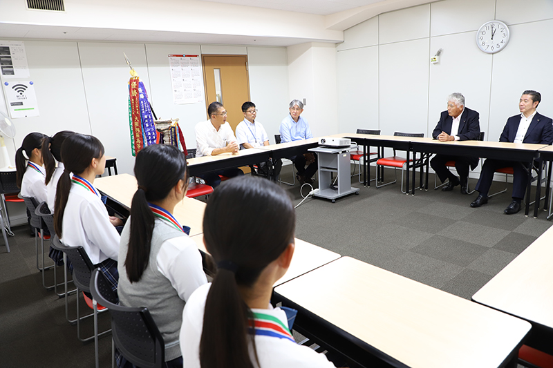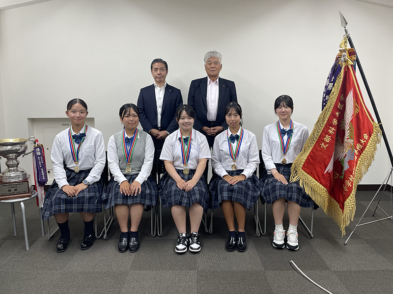 文部科学大臣旗を手に、山口学園の本部に凱旋し、酒元理事長、要学園長へ優勝報告を行いました。