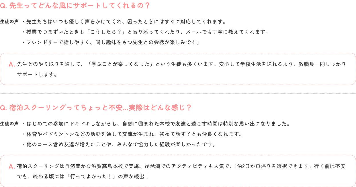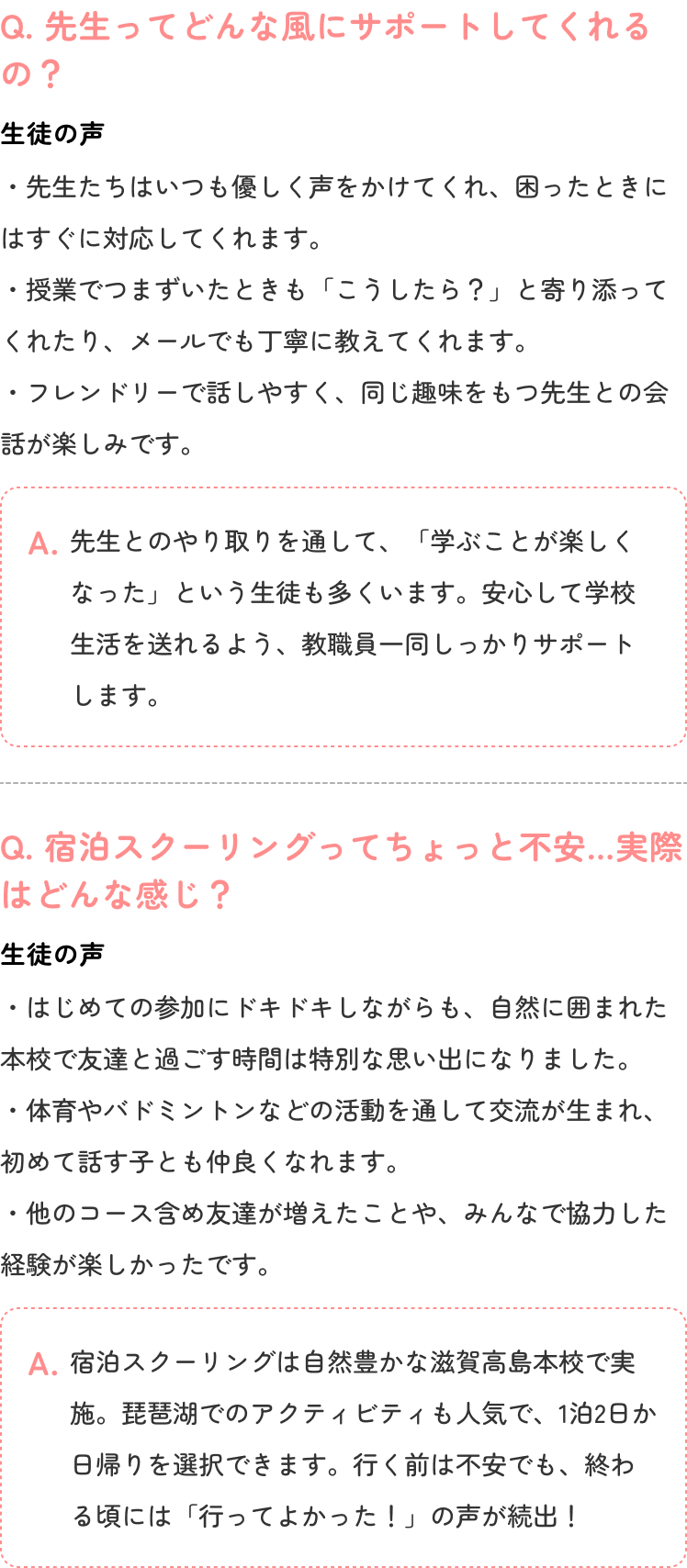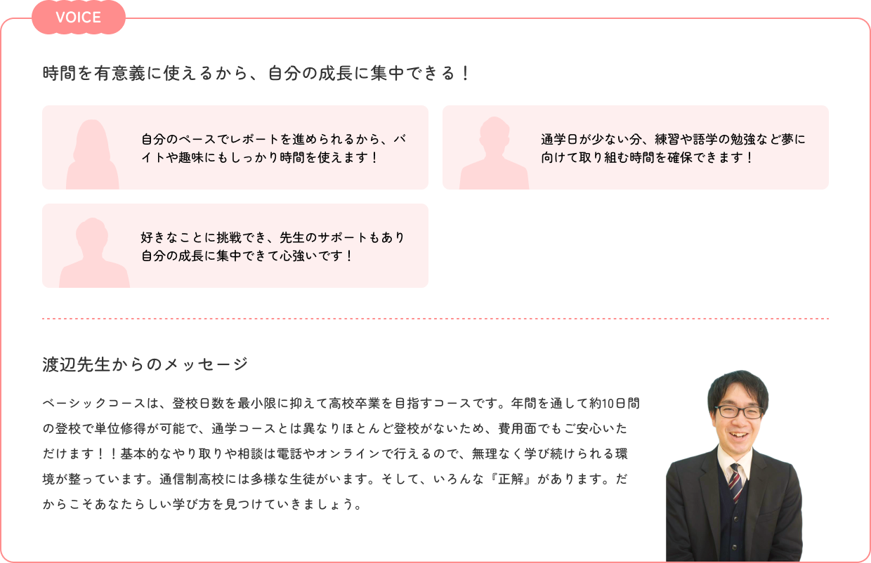 スクーリングやテストでの通学は、年間10日程度のため、心理的・精神的負担が少なく、安心して学習を続けられます。スクーリングの日も、やさしい先生が見守ってくれるので、緊張せず落ち着いて学ぶことができます。