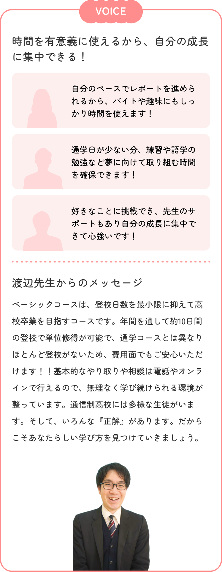 分からないことや悩みも、オンラインでいつでも相談できます。オリエンテーションや進路面談もオンラインで行えるので安心。学習計画や課題も一緒に確認してもらえるので、自宅中心の学習でも「ひとりじゃない」という安心感のもと、着実に卒業に向けて歩んでいけます。