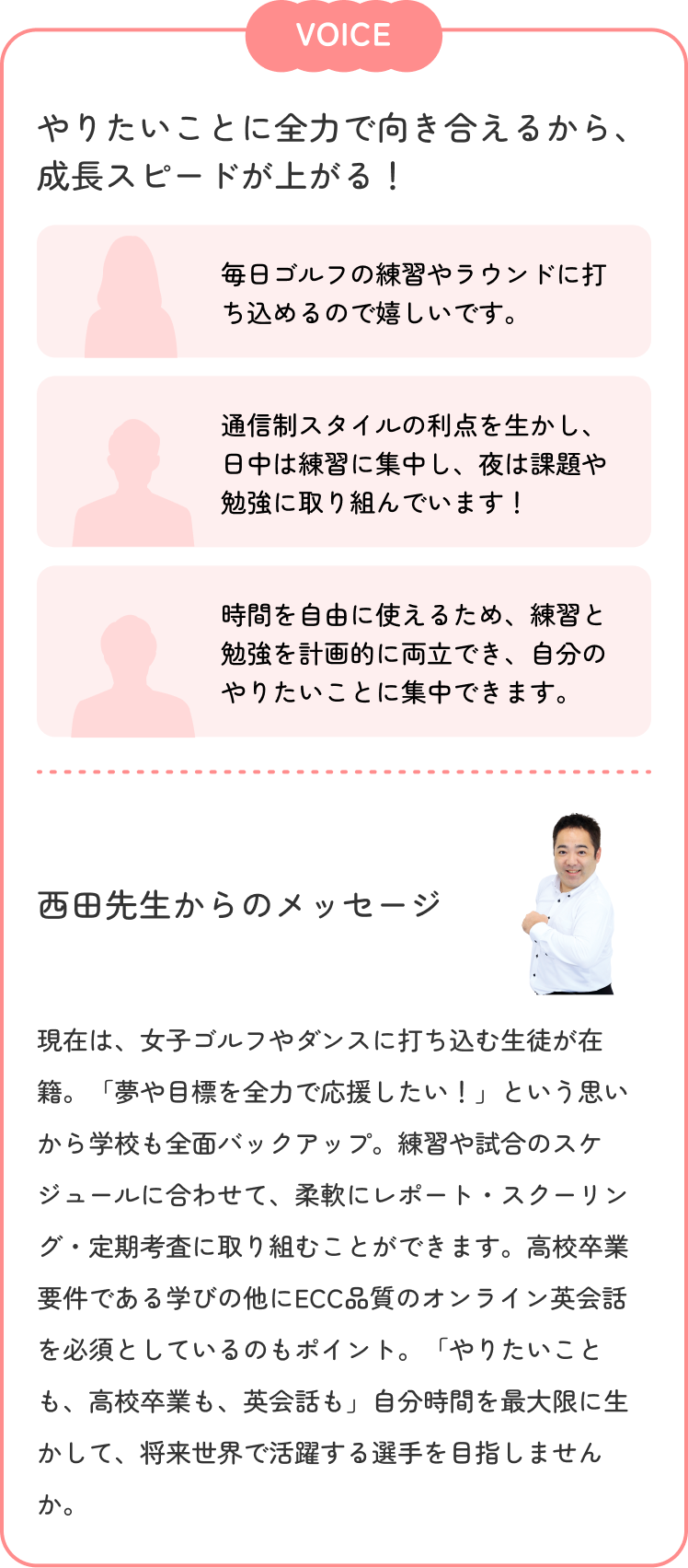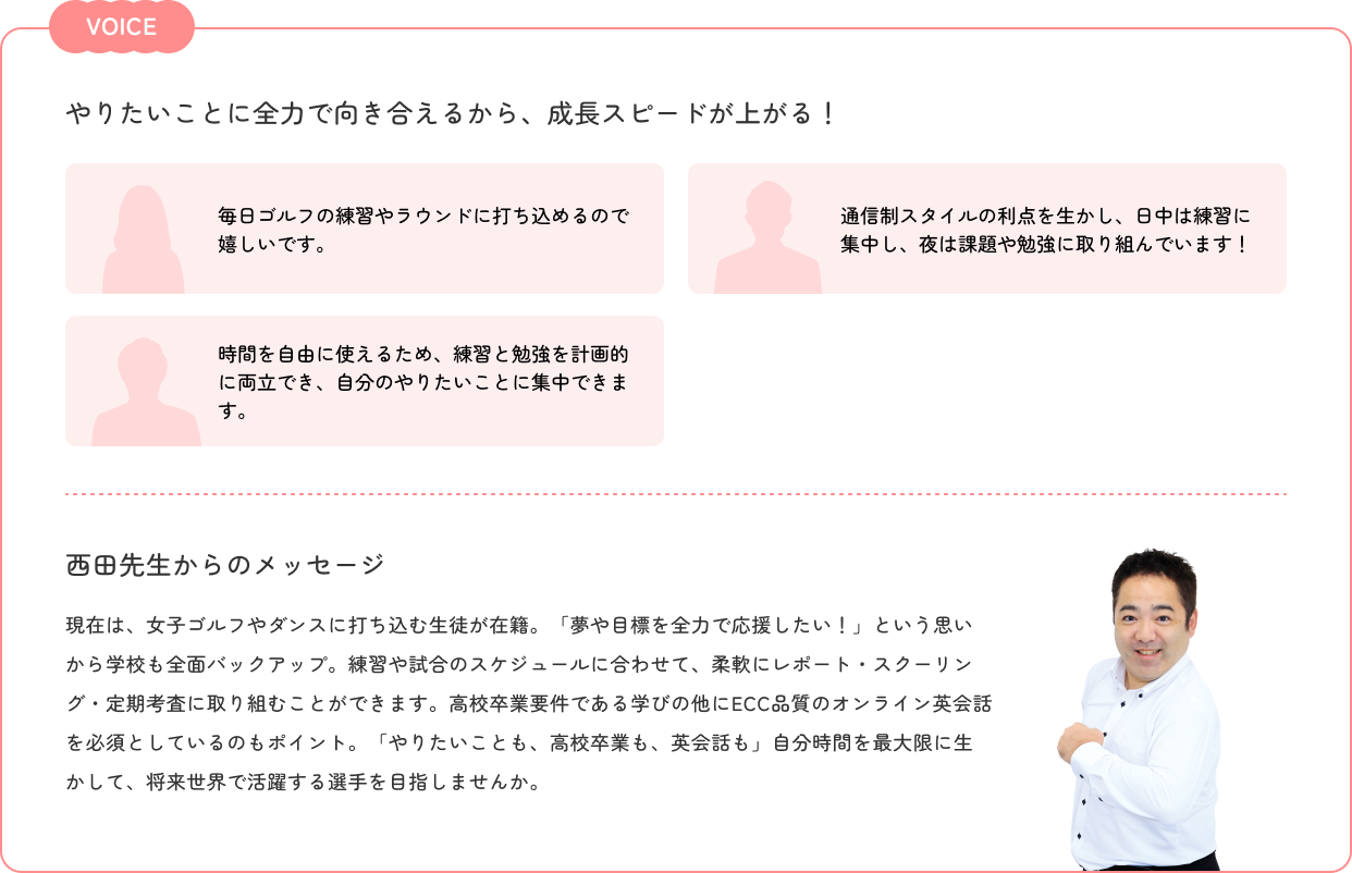 世界で活躍するアスリートになれるよう、ECCオンライン英会話で、発音が聞き取りやすい講師とのマンツーマンレッスンを実施。自分のレベルに合わせて学べるから、英語が苦手でも楽しく実践的に力を伸ばせる!